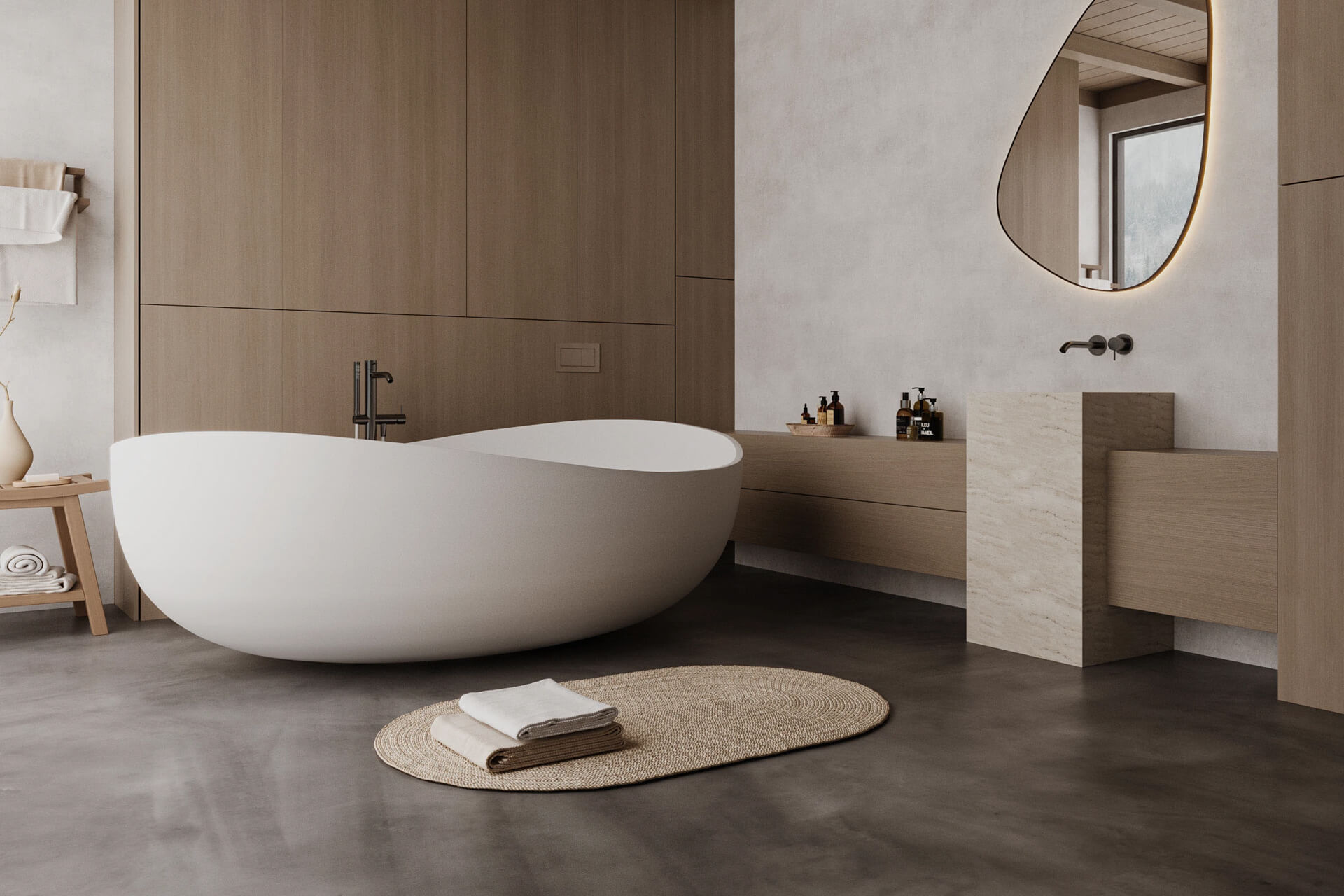 Soft lighting and clean materials define a calm, contemporary bathroom atmosphere.