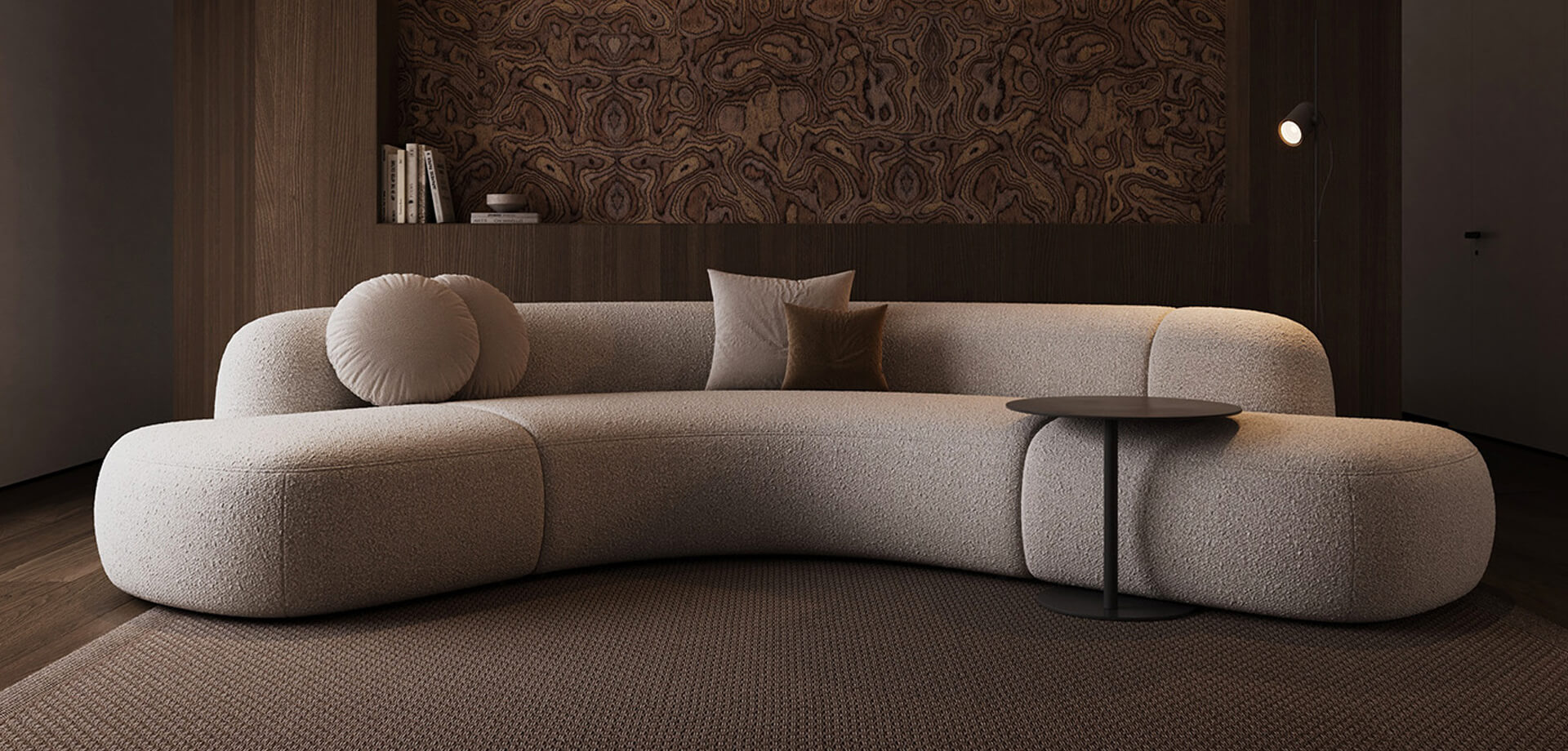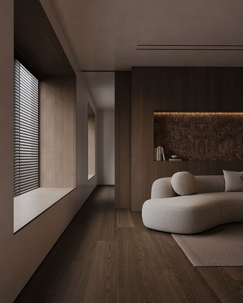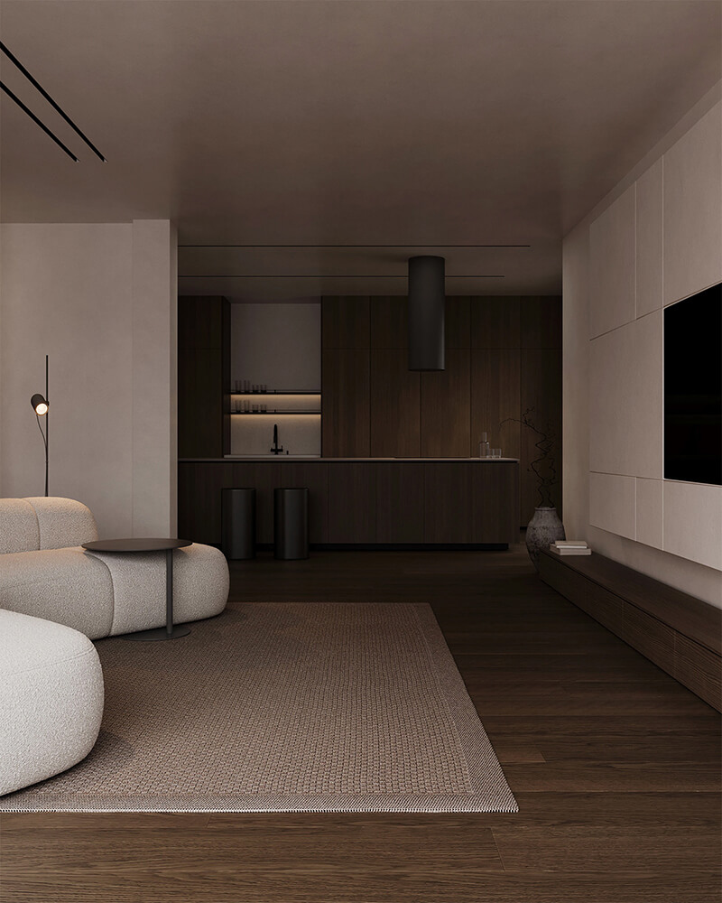 Soft neutral tones, natural textures, and carefully curated furniture pieces define the visual language of the interior. Every element from the lighting arrangement to the choice of fabrics has been thoughtfully selected to enhance spatial harmony and flow.